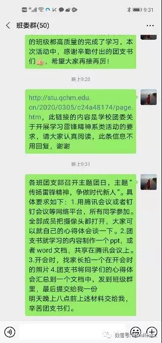 3月6日,辅导员借助“云班会”以及微信班级群平台,积极召开团支书会议,在会上传达了学院团委关于开展学习雷锋精神系列活动的要求,并对主题团日的学习内容、形式、预期效果作出了具体的指导,确保各团支部能够高质量地开展主题团日。