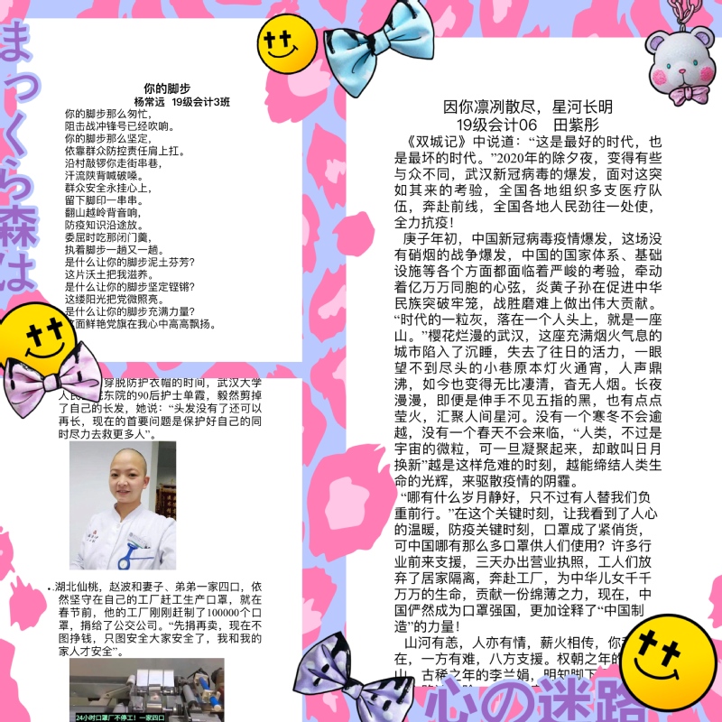 本次活动为系列活动之一——才艺大赛。活动设置了文学类、书法漫画类、音视频类等多种参赛方式,鼓励大家发挥自身特长,采用自己的方式来点亮自己的那一道光。此次活动共收到作品47份,展现了我院学子积极热情的态度,每一个作品都有着不同的意义,每一个作品都包含着同学们真挚的情感。