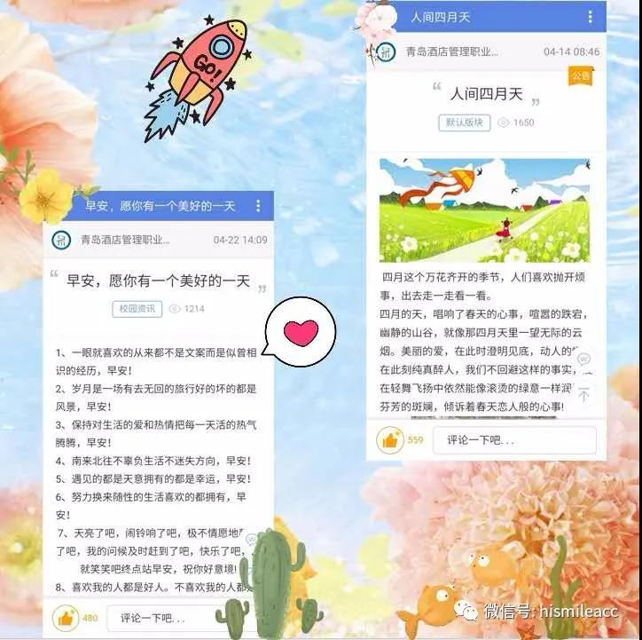 在开展征文活动的同时,易班平台推出两篇正能量推文:《人间四月天》《早安,愿你有一个美好的一天》。短时间内,同学们高度关注,积极参与留言,其中《人间四月天》浏览次数1650次,《早安,愿你有一个美好的一天》浏览1214次,同学们对易班平台的关注度有所提高,活动的参与度也逐渐上升。