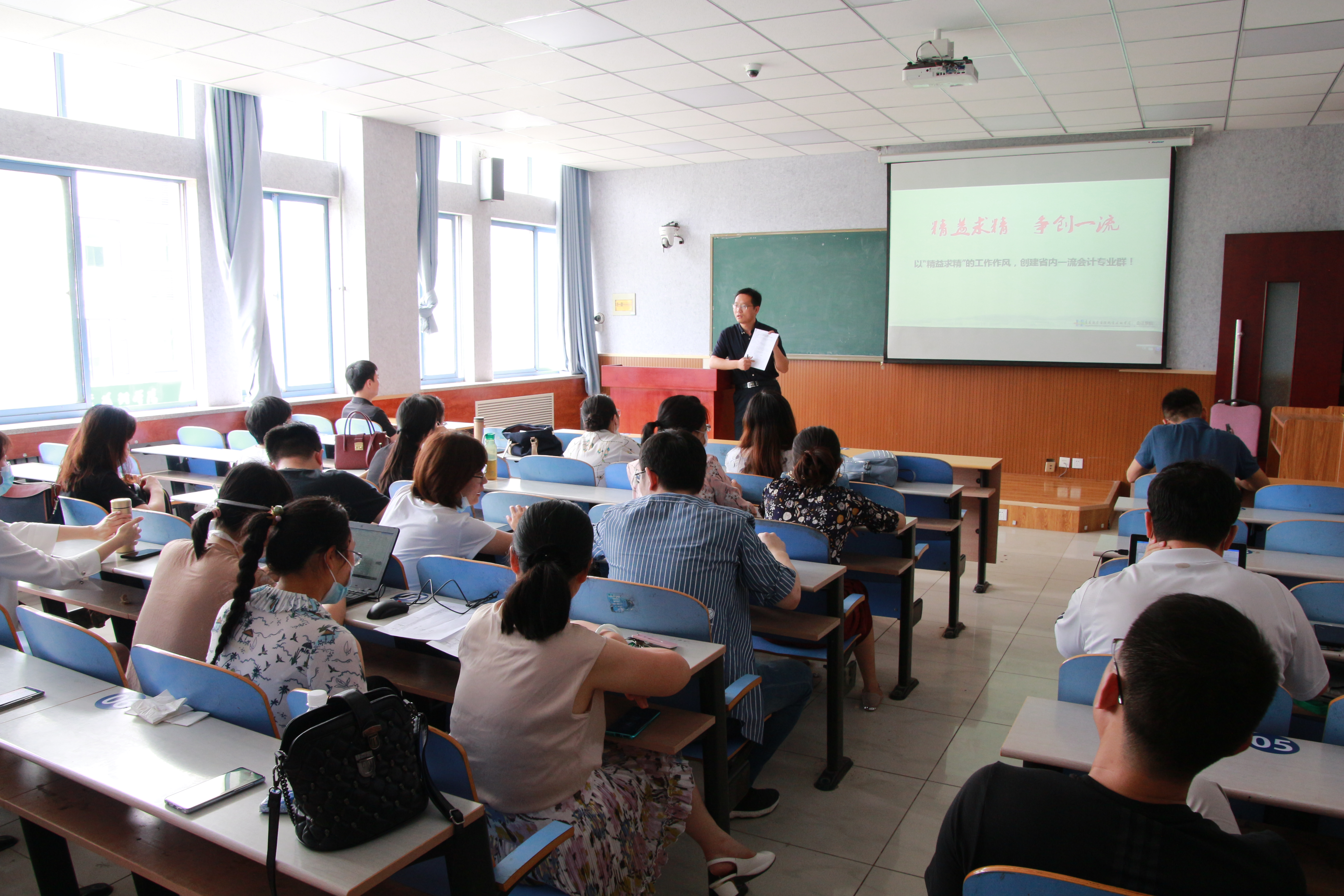 刘进涛副院长结合山东省高等职业院校专业(群)发展水平考核指标体系,介绍了会计专业群建设的重要性和必要性,重点阐述了专业群定位与组群逻辑,结合三教改革等内容阐述了专业群建设规划举措,重点介绍了教师改革的“九个一”工程,鼓励全体教师自我加压、自我提升,为把会计专业群建成省内一流专业群多做贡献。最后,部署了期末及假期重点工作。