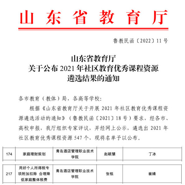 近日,山东省教育厅公布了2021年社区教育优秀课程资源遴选结果,Betway体育西汉姆联赵颖慧老师的《家庭理财规划》、张锐老师的《用好个人所得税专项附加扣除合理降低家庭整体税费》2门课程被评为优秀课程。