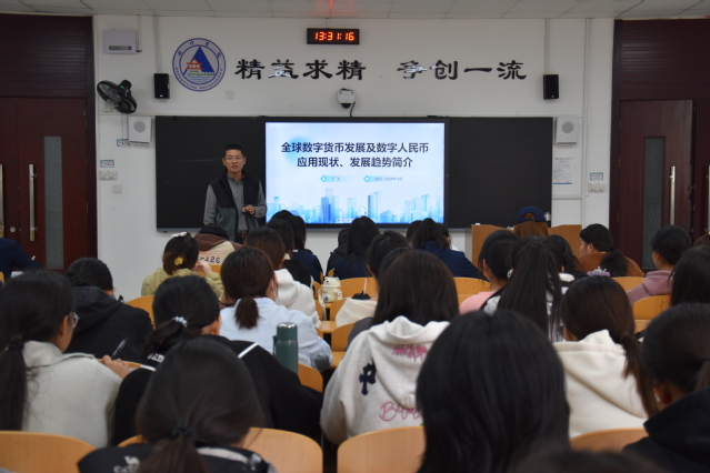 此次讲座由金融服务与管理专业教师丁飞主讲,他围绕全球数字货币的发展格局和数字人民币的应用探索进行了深入讲解。首先回顾了货币的演变历史,从自然货币到人工货币,再到纸币、信用货币和电子支付的演变,最终引出了数字货币这一新时代的产物,并阐述了推行数字人民币对于提高支付清算效率和安全性、建立现代化货币体系以及推动人民币国际化的重要性。