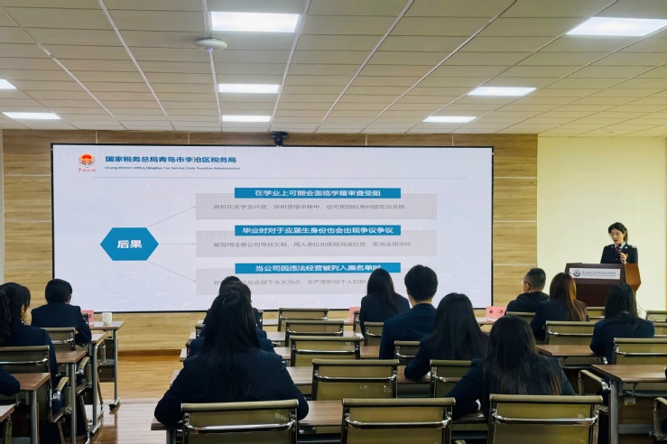 学院邀请青岛市李沧区税务局青年干部代表韩岳君、刘颉作《数字时代大学生个人信息保护和创业支持指南》专题分享。讲座紧扣数字经济新形势,结合真实涉税案例,既讲解个人信息保护、涉税诈骗防范要点,又解读大学生实习就业、自主创业相关税费优惠及办税流程,引导学生树立“知税法、懂税法、守税法、用税法”的法治观念,为青春成长筑牢税收安全防线。